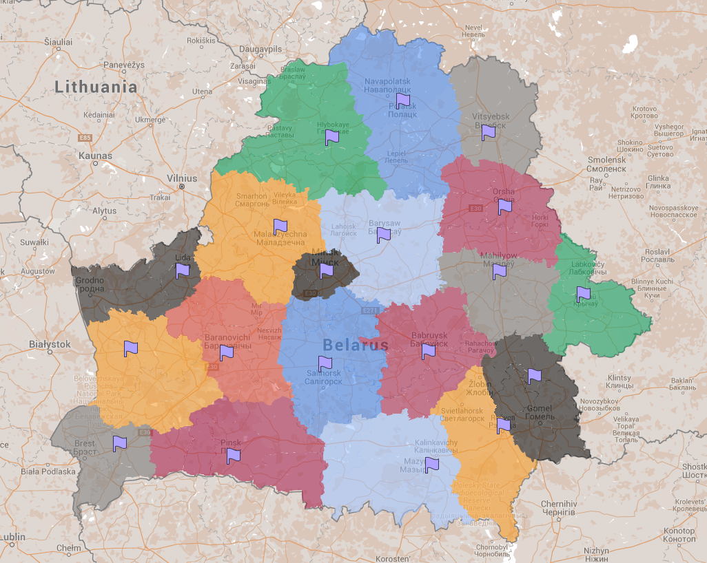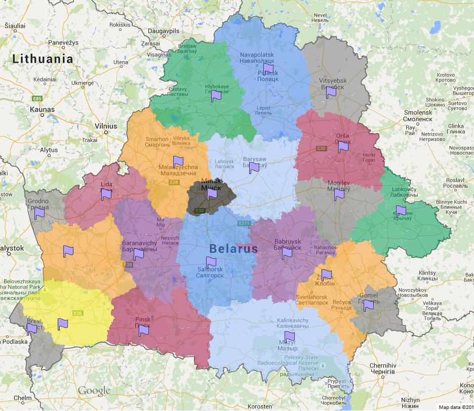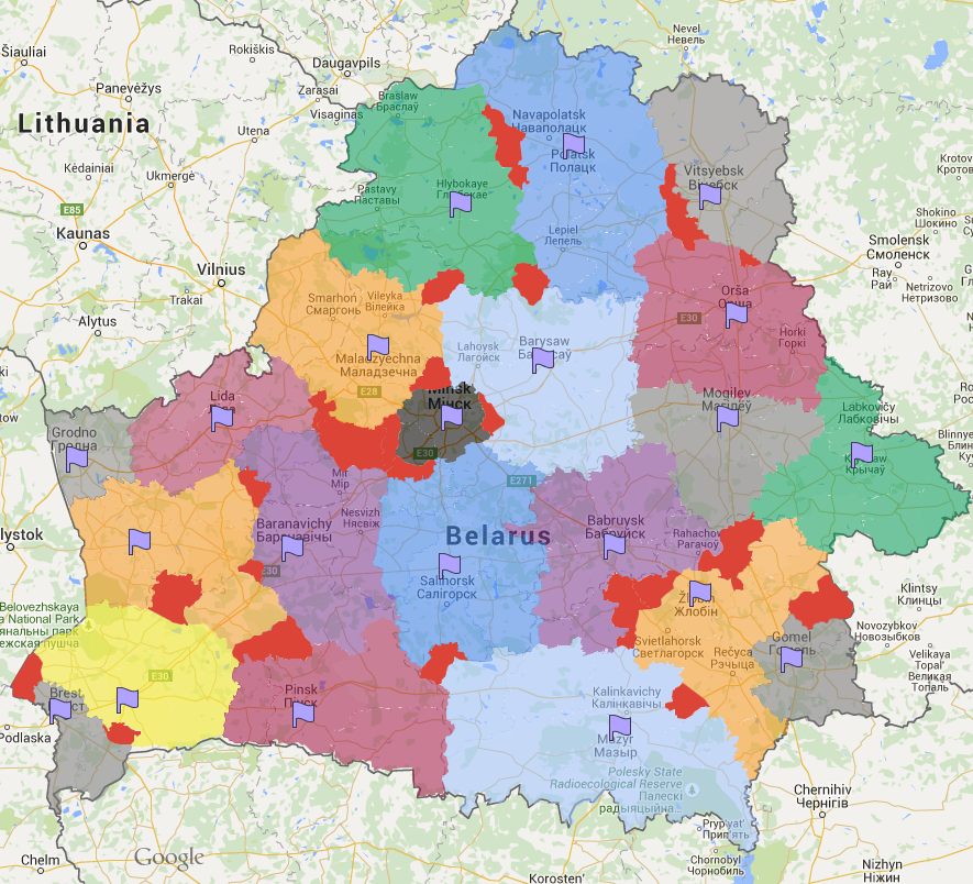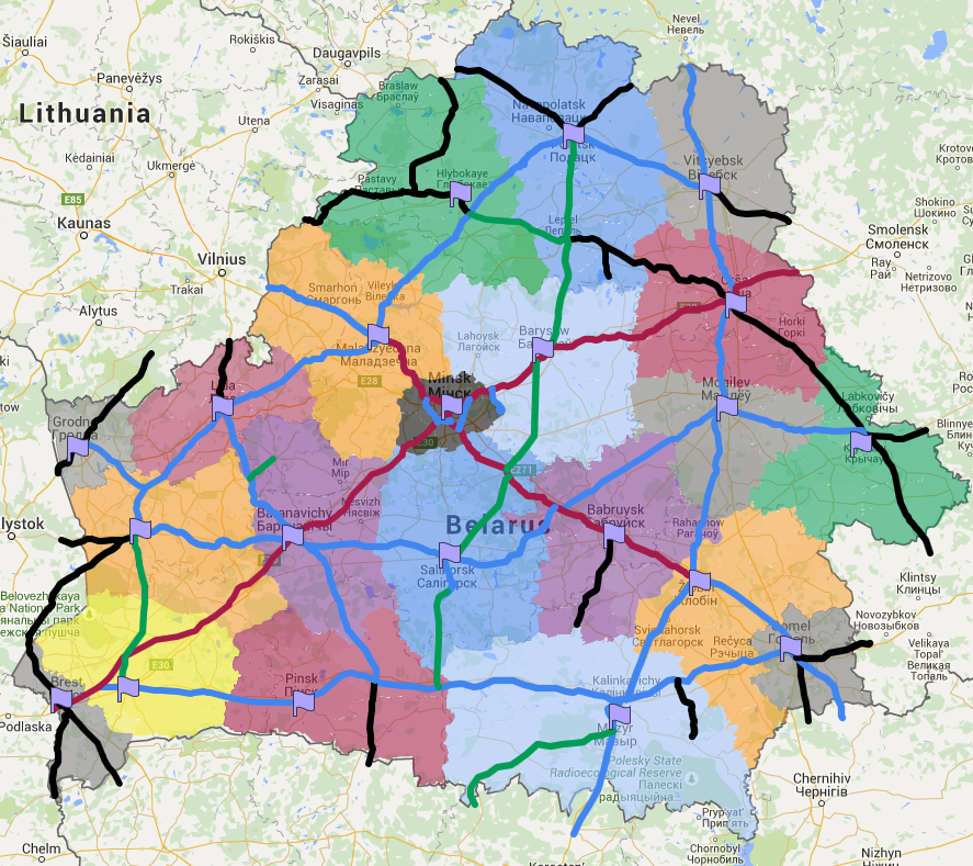 Вальдэмар, в общем у вас получился практически мой вариант с 37-й страницы. Только я учитывал существующие ж/д и крупные магистрали. Поэтому, например, я отнёс Марьину Горку к Минску, как оттуда ездить в Слуцк/Солигорск я не представляю.