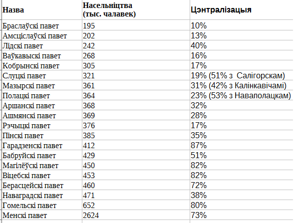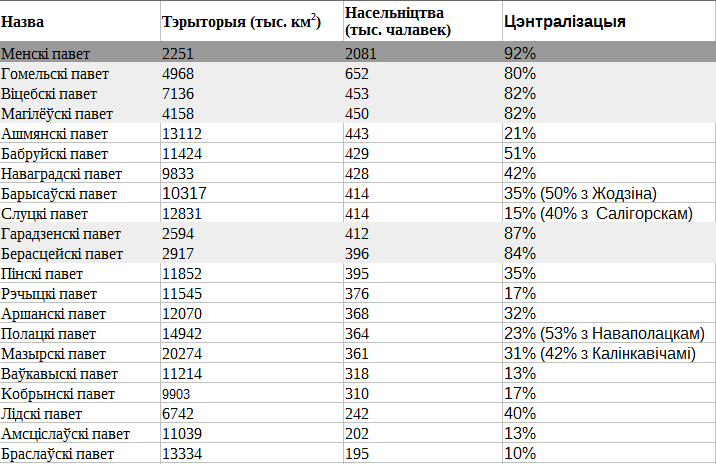 Ошмянский повет: тут всё понятно, отличие от брамовского только в добавленом Ивьевском районе (что исторически обосновано). 369 тыс. , из них в Молодечно 27%. Молодечно выступает пробкой в столичном пылесосе, сам регион равномерно населён, культурно и экономически самодостаточен и один из самых перспективных (строится АЭС, транзит в Литву).