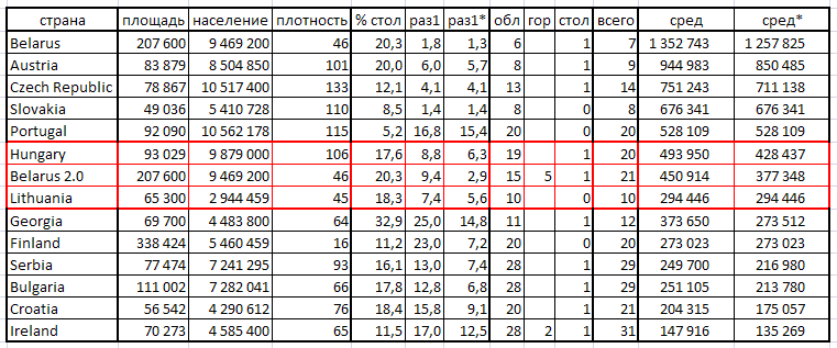 И Вы увидите, что у Вас получились монстры и лилипуты. Ни намека на нормальное распределение. А потому все это будет не устойчиво. В начале ветки было обсуждение районирования Ридевского, и предлагавшаяся реформа Совмином БССР в 80-х годах. Они - отличные отправные точки, чтобы не ходить по старым ошибкам.
