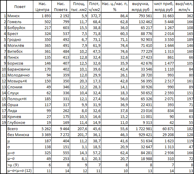 Дубль два, 18 поветов+1 столичный округ, без городских округ с большим вниманием к основным ж/д и автодорогам. Специально посчитал значения по выручке и прибили, а также МО и СКО(без Минска). Для последних двух строк таблицы 9 и 12 идеальное значение, а цифры в строках частота попадания в интервал.