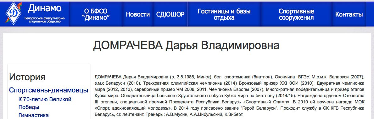 «До июня 2014 года Домрачева состояла на службе в КГБ, но в настоящий момент Дарья Владимировна не является сотрудником ведомства».