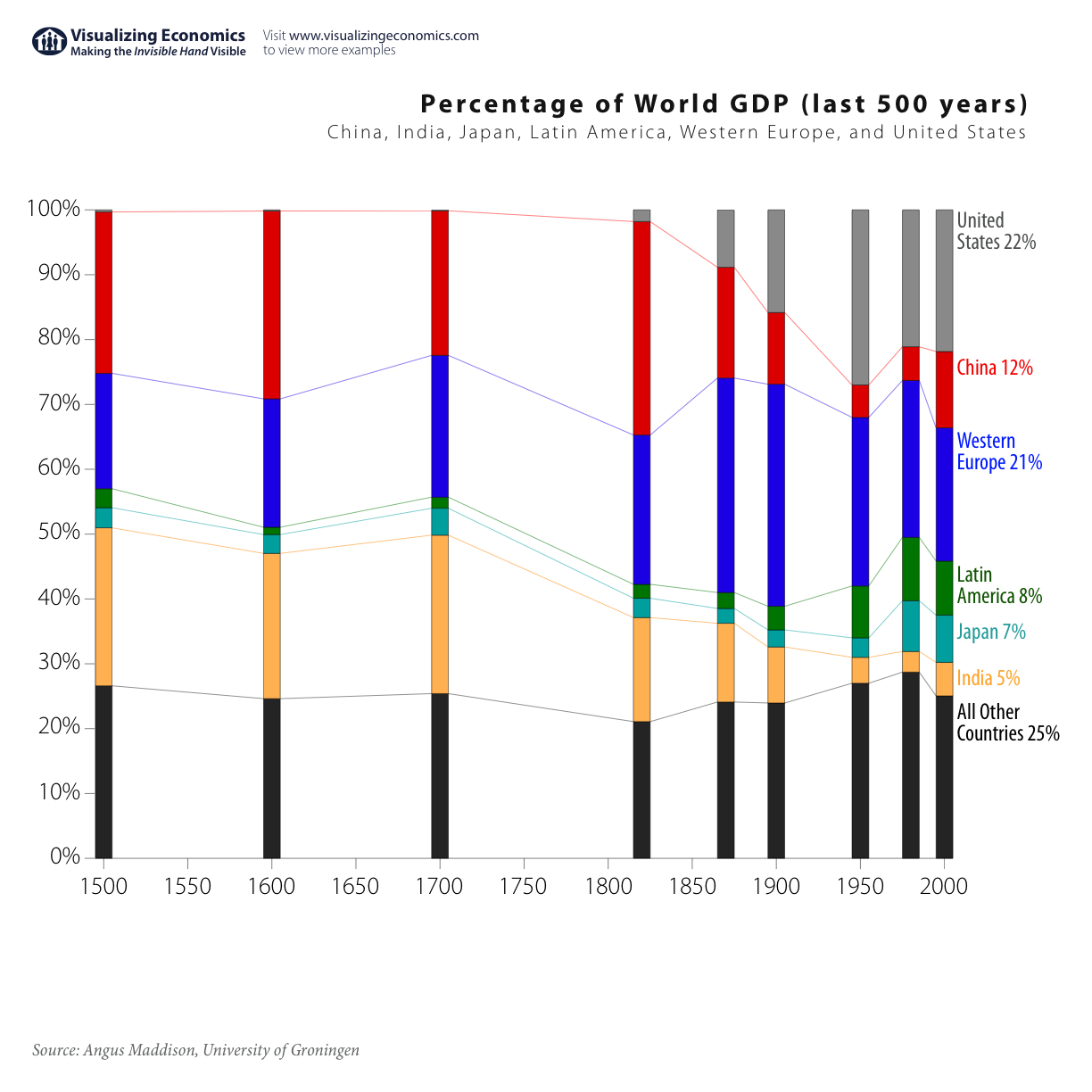 Мировой ВВП за последние пол тысячелетия. Сверху вниз: США, Китай, Западная Европа, Латинская Америка, Япония, Индия, прочие. Индия и Китай искусственно малы, поэтому на них все и ставят - недооцененный ресурс.