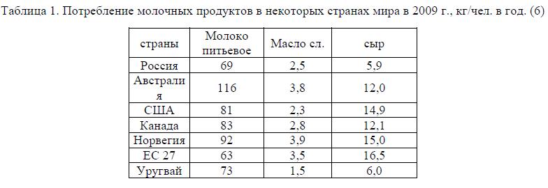 Таблица 1. Потребление молочных продуктов в некоторых странах мира в 2009 г., кг/чел. в год. (6)