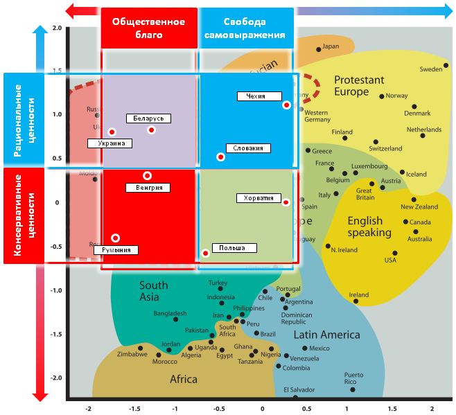 Наконец, Чехия. С геополитической точки зрения ее участие не столь важно и без нее, вероятно, данный союз сможет состояться. Однако, специфика развития чешского бизнеса, ориентированного на страны Интермариума, а также прогрессивные чешские ценностные ориентиры делают ее уникальным балансирующим элементом в общей структуре. Если взглянуть на данные Исследования мировых ценностей (4), то становится видно, что именно Чехия помогает уравновесить Интермариум как по линии религиозных ценностей против рациональных, так и по линии самовыражения против общественной доминанты, делая Интермариум идеально сбалансированным. Если убрать Чехию из первоначальной формулы Интермариума, то данный блок окажется сильно перекошен в консервативно-религиозную сторону со склонностью к государственному диктату.