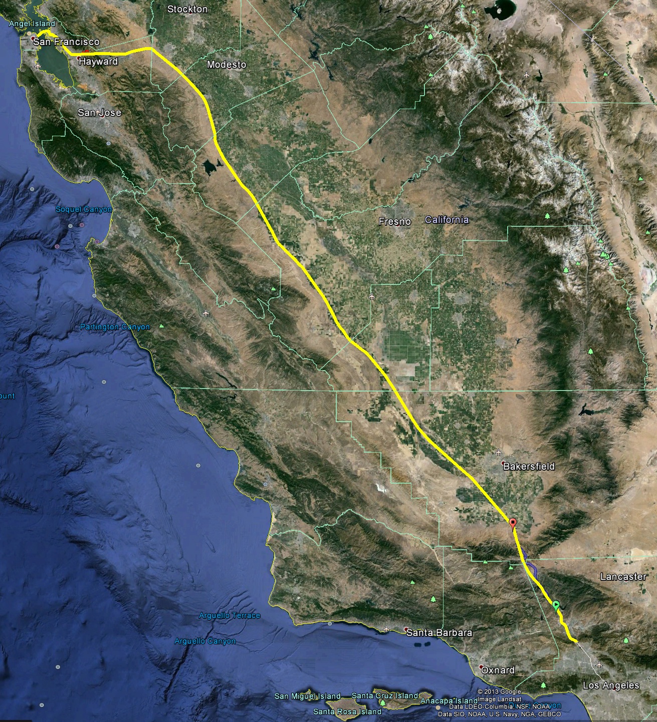 Первый предложенный проект - дорога между Лос Анджелесом и Сан Франциско - которая должна будет занимать 35 минут. Расстояние это составляет 570 км (примерно соответствует расстоянию Минск-Киев), средняя скорость движения будет составлять 962 км/ч, с максимальной скоростью 1220 км/ч.