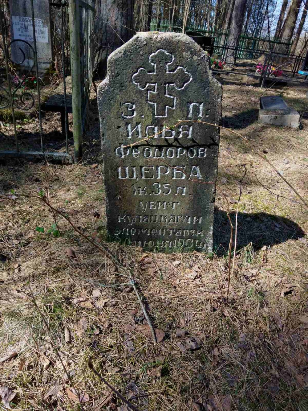 Фото: Могила Ильи Фёдорова Щербы на кладбище д.Оздятичи. Убит он был как раз летом 1934 года, когда схлопотал свою пулю и Николай Волковец