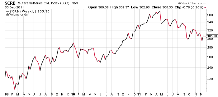 Вот индекс биржевых товоров к доллару за 3 года до конца 2011 года (Stockcharts бесплатно больше не даёт)