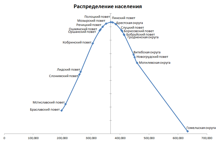 Получившееся распределение населения соответствует гауссовому (нормальному) распределению. Гомельская округа, конечно, чуть-чуть перекашивает картину в силу своей величины, но тем не менее все остается полностью в требуемых рамках.